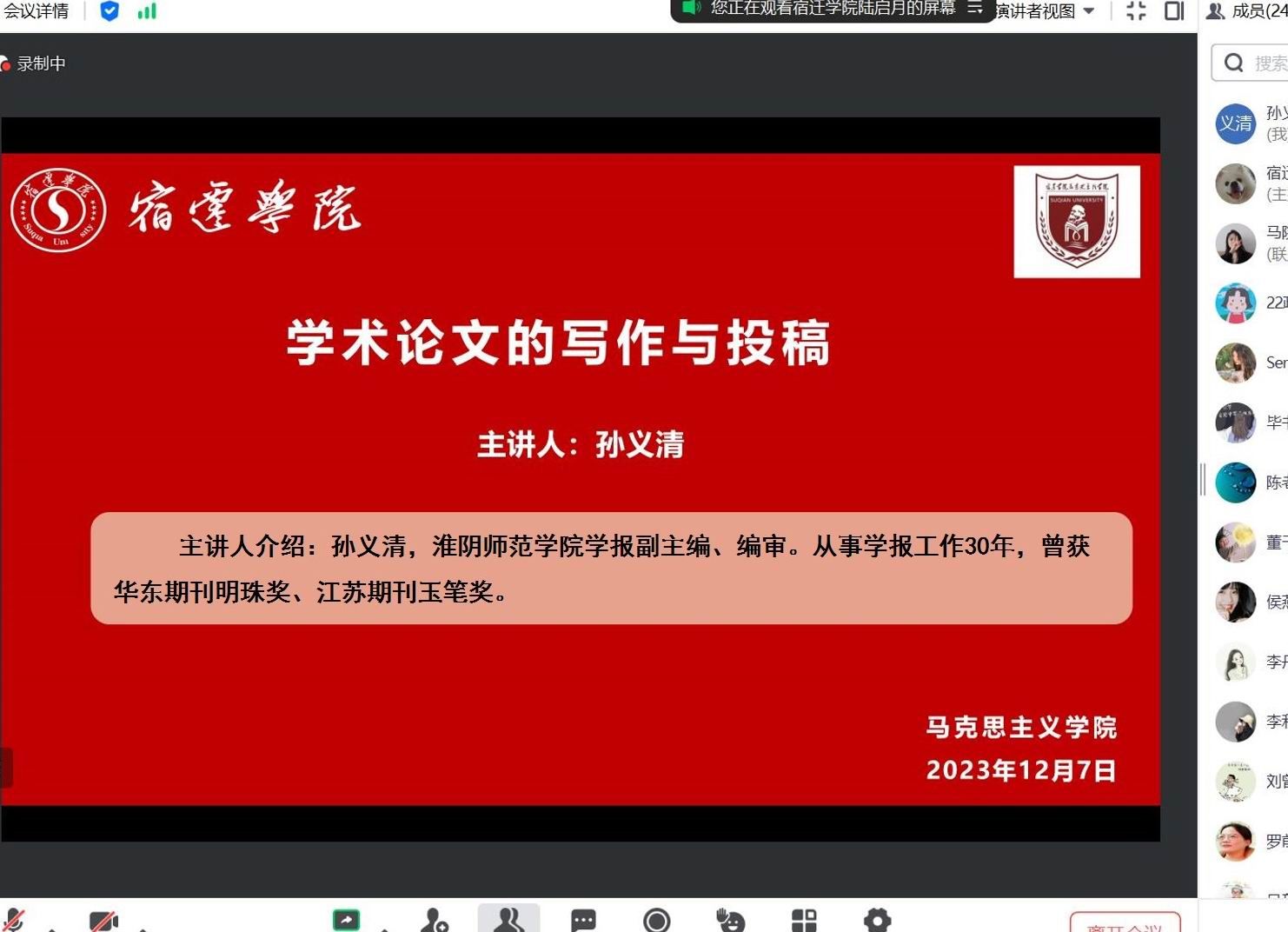 12月7日,应宿迁学院马克思主义学院邀请,学报编辑部孙义清编审作“学术论文写作与投稿”专题视频讲座。宿迁学院马克思主义学院领导班子成员、思政课教师及部分学生代表参加会议。讲座由马院科研分管领导陈丽杰主持。