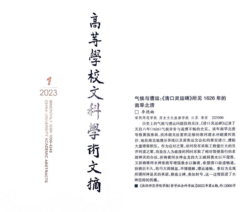 《淮阴师范学院学报(哲学社会科学版)》学术影响力持续提升。2023年综合影响因子和复合影响因子较之2022年分别提升61.9%和11.7%。学报哲社版刊发论文多篇被转载:《气候与漕运:〈清口灵运碑〉所见1626年的南旱北涝》被《高等学校文科学术文摘》转载;《“与老杜歌诗同其沉郁—〈文史通义解读〉撰著感言》和《硕士研究生的学习方法—以中国近现代史为例》等被“国家图书馆出版社”“历史学研究通讯”等多家公众号转载,这既是对学报刊发论文质量的肯定,又扩大了学报的学术影响力。