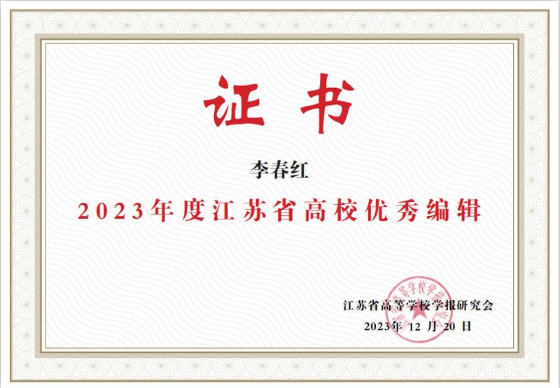 近日,在2023年度江苏省高校学报“优秀编辑”评选中,学报自然科学版编辑李春红获评“优秀编辑”。李春红是一位有15年工作经验的资深编辑,任江苏省科技期刊学会青委会副主任、江苏省科技学会学术期刊专委会秘书长。李春红工作认真负责,在江苏省高校科技期刊编校工作抽检中编校差错率为零,在期刊界树立了良好的声誉。此次获评“优秀编辑”,反映了学报编辑队伍建设的良好成效。