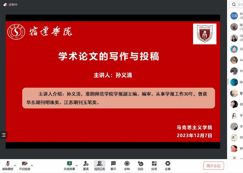 学报编辑部努力提高服务社会能力,积极参与服务社会。学报编辑部孙义清编审为宿迁学院作“学术论文的写作与投稿”专题讲座。孙义清讲解了学术论文的写作要求、格式规范以及投稿中需要注意的问题,介绍了《淮阴师范学院学报》投稿要求和相关管理规定,并对与会师生提出的问题作了详细解答。讲座彰显了学报编辑的业务能力和水平,在社会服务中提升了学校学报编辑部的社会影响力。