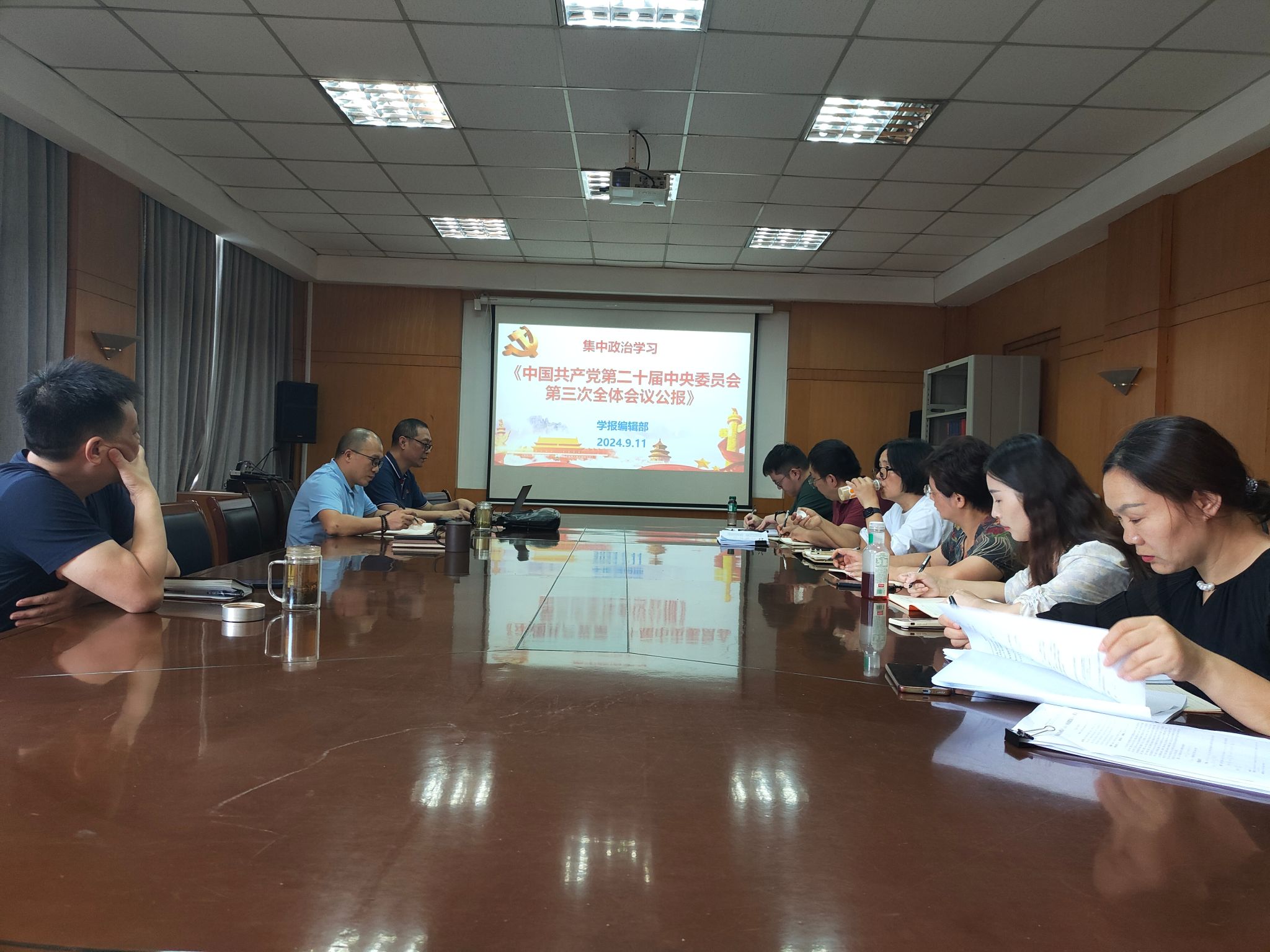 为了深入学习贯彻党的二十届三中全会精神,学报编辑部党支部于2024年9月11日下午在417会议室开展集中政治学习活动。此次集中政治学习的内容是《中国共产党第二十届中央委员会第三次全体会议公报》《中共中央关于进一步全面深化改革 推进中国式现代化的决定》,以及习近平总书记关于《中共中央关于进一步全面深化改革、推进中国式现代化的决定》的说明。学报编辑部党支部所有党员参加学习,支部书记刘晓苏主持学习活动。