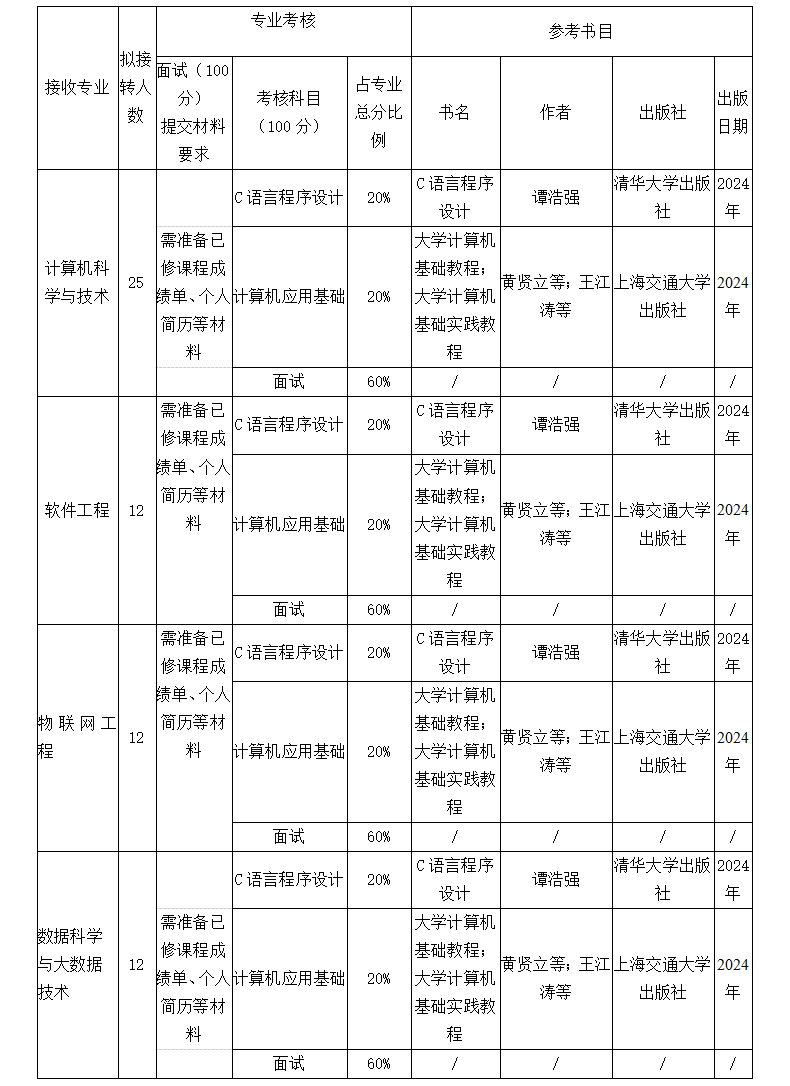 转专业学生需参加3200威尼斯科学与技术学院的课程《C语言程序设计》和《3200威尼斯应用基础》两门课程的考试。面试环节转专业学生需准备已修课程成绩单、个人简历。