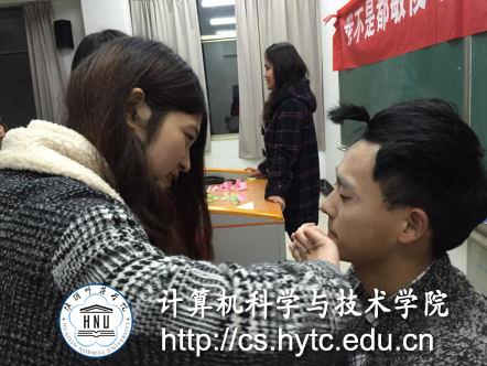 活动开始,主持人播放了《女生节特别策划——“一千秒计划”》拉开了此次活动的序幕,接着由主持人向大家提问一些关于礼仪,化妆,服装搭配的问题。由回答最好的两位女同学给男同学限时化妆,让大家在实践中更好的学习。接着由同学们准备节目,进行表演。