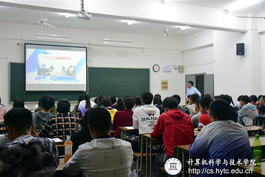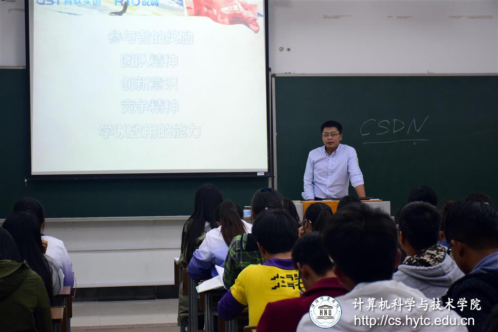 然后,他从青软实训及青软基地和概况入手,向同学们介绍物联网专业的就业前景以及如何在高压力就业中脱颖而出。最后,在讲述物联网的定义以及嵌入式技术在生活中广泛的的应用后,他详细地向同学们介绍了锐聘之星程序设计大赛和参加大赛的要求、精神与能力,并鼓励同学们积极报名参加,在实践中锻炼并提升自己的能力。