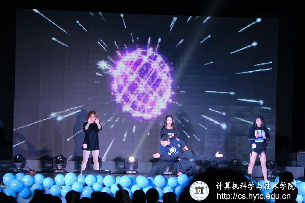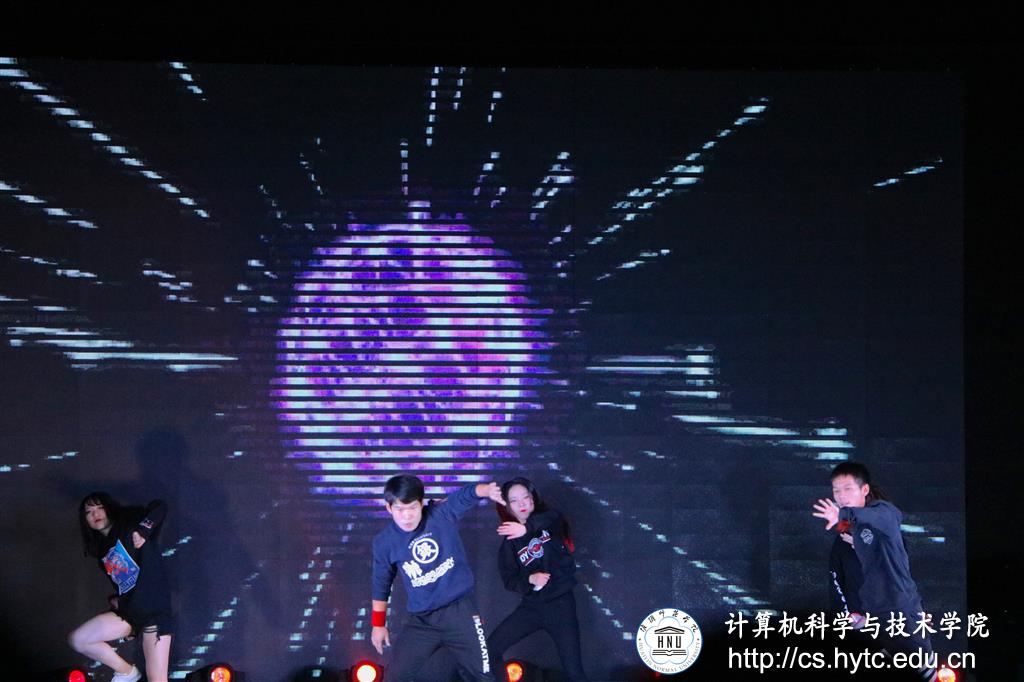 晚会开始,文院《格桑花》的素袖翩扬、历史文化《如此创业》的诙谐幽默在不断加深着台下对于计科舞队的期待。在迫切的等待中、在消息墙上一句句对计科的加油助威下,由我院凌天浩等人带来的现代舞《beat hit》闪亮登场。黑色的衣服闪烁眼球、风车旋转秀出自信、弹踢舞姿张扬自我,行云流水的动作中渗透着狂放与自信,豪放却又不失和谐,激情却又透着自信。