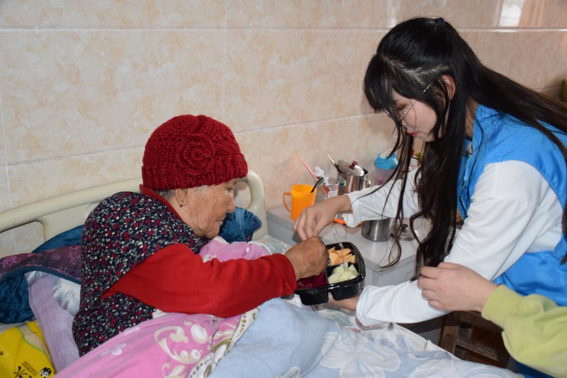图为志愿者为公寓老人送来水果。记者 王丹 摄。