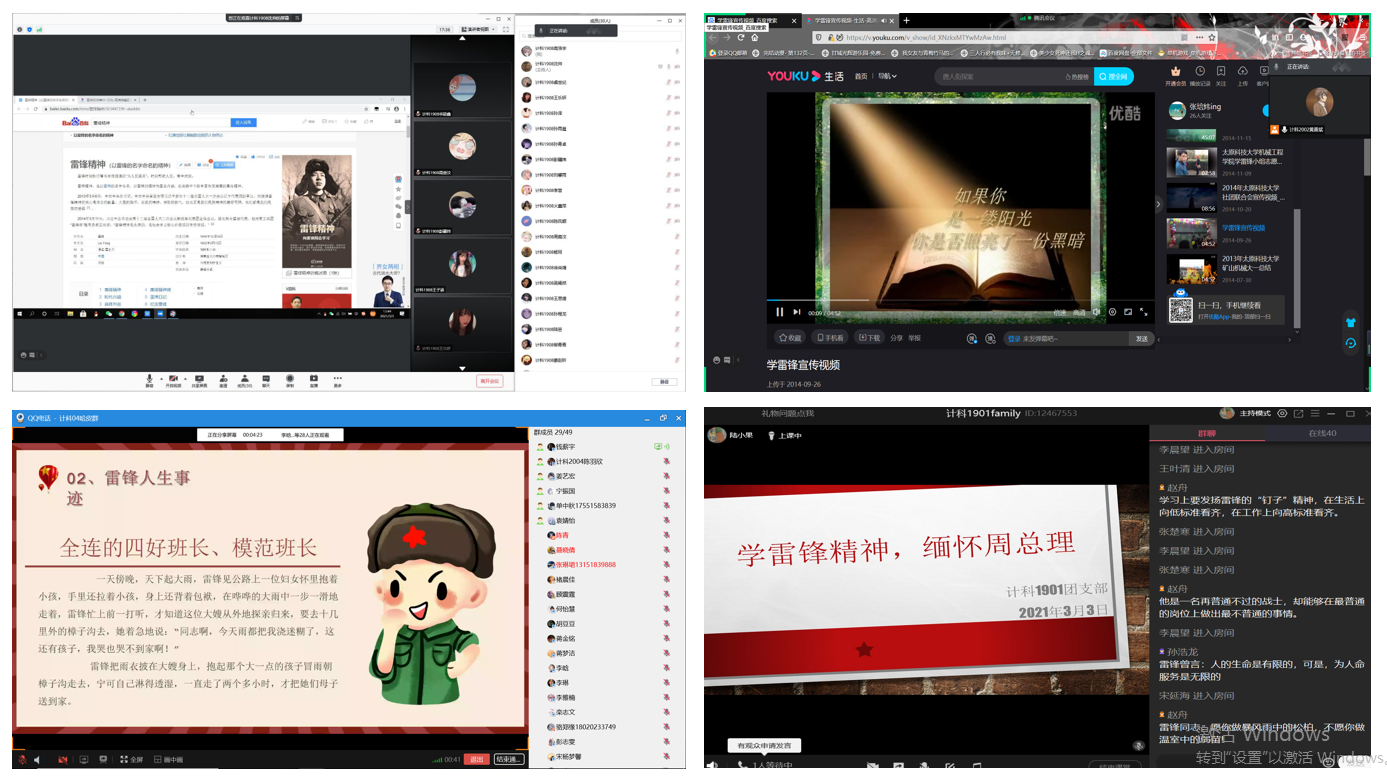 活动中,计科学院积极响应学校号召,以“线上教学,线下实践”的形式学习弘扬雷锋精神。2月28日到3月2日,计科学院面向全院同学开展了关于党史、新中国史、改革开放史和社会主义发展史四场线上宣讲,帮助同学们了解学习新时代中国特色社会主义思想。自3月1日起,计科学院各团支部围绕雷锋同志的感人事迹,组织开展了主题团日活动。充分利用网络资源,举行线上会议。利用PPT讲解雷锋精神和周恩来精神含义、观看雷锋感人事迹视频、集体朗诵雷锋名言、开展关于雷锋精神和周恩来精神的线上讨论等班级活动,用实际行动弘扬雷锋精神,帮助学生深刻理解雷锋精神的历史意义和时代内涵。