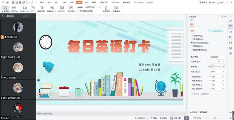 为提高同学们的英语学习水平,近日,计科学院2007班开展线上每日英语打卡活动。