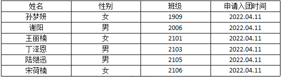 由学生自愿申请,各班级团支部考察推荐,学院研究拟定孙梦妍、谢阳、王丽楠、丁泽恩、陆继迅、宋荷楠六位同学为计科学院2022年入团积极分子,现予以公示。