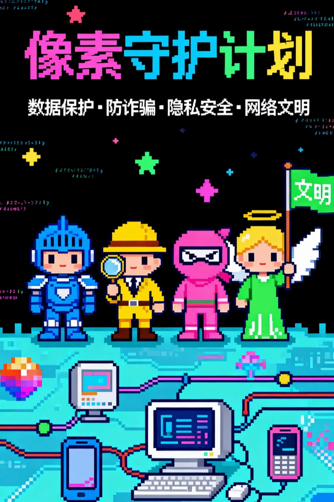 活动围绕“网络安全”主题展开。参赛者需结合网络安全主题,运用AI技术进行海报创作。选手们所设计的海报风格迥异,积极向上的海报内容生动形象地展现了当代大学生的蓬勃朝气和青春活力。