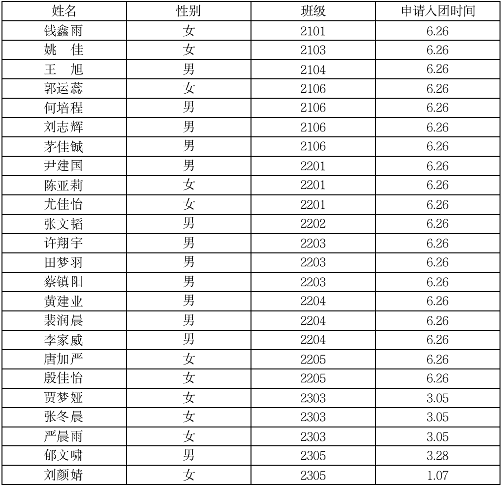 由学生自愿申请,各班级团支部考察推荐,院团委拟钱鑫雨、姚佳、王旭、郭运蕊、何培程、刘志辉、茅佳铖等同学为2023年共青团员发展对象,现予以公示。