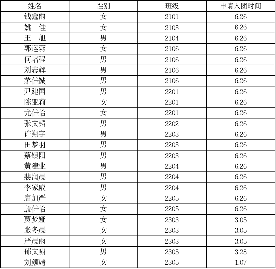 由学生自愿申请,各班级团支部考察推荐,院团委拟定钱鑫雨、姚佳、王旭、郭运蕊、何培程、刘志辉、茅佳铖等同学为2023年新入团成员,现予以公示。