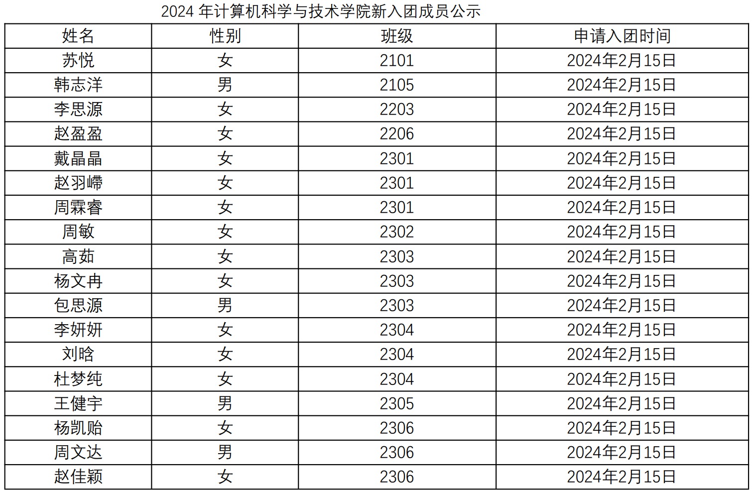 由学生自愿申请,各班级团支部考察推荐,院团委拟定苏悦、韩志洋、李思源、赵盈盈、戴晶晶、赵羽嵽、周霖睿等同学为2024年新入团成员,现予以公示。