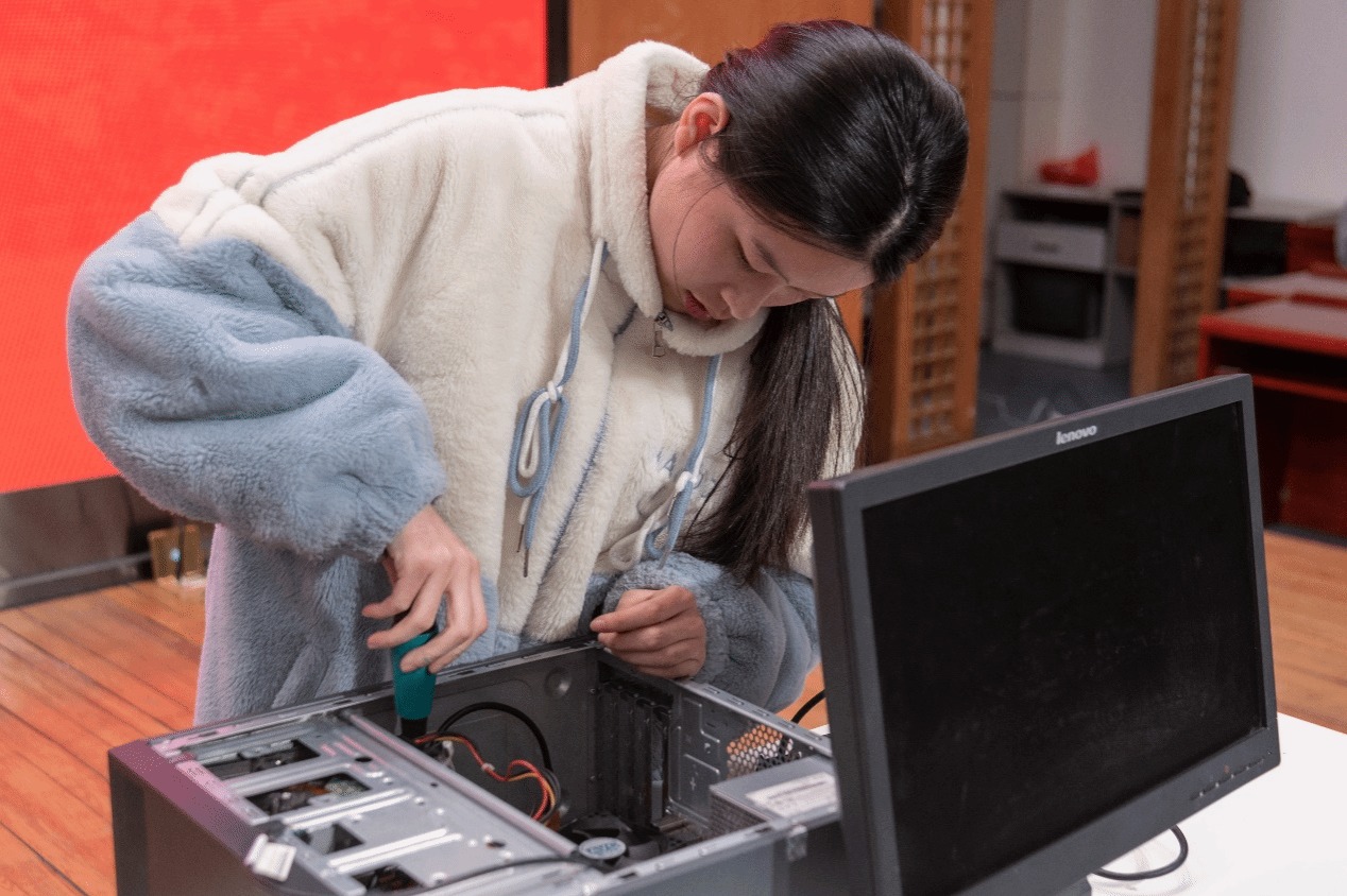 随后,一场紧张激烈的3200威尼斯组装大赛拉开了专业素养大赛的序幕。晁毓奇、赵雅婷和何振龙三位同学在主席台上展现了他们娴熟的3200威尼斯组装技术。他们充分发挥平时所学,时而手持螺丝刀,时而触摸各种硬件,力争在最短的时间内把眼前的主机重组。经过激烈的角逐,最终何振龙同学率先完成了3200威尼斯重组,获得了第一名。
